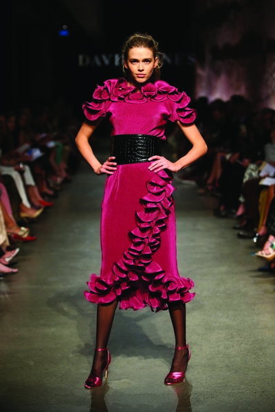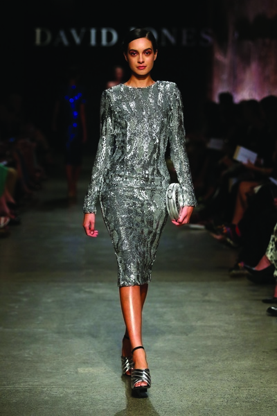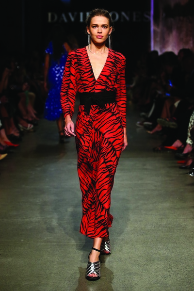 Romance Was Born resounded Jazz’s sentiments, styling their burgundy ruffle dress for the David Jones Runway with stockings and matching metallic sandals to add edge to the garment’s orchid-like intricacy. On the shoe front, Jazz recommends Jaggar the Label for their abstract heel shapes in Autumnal tones of Aubergine and Cornsilk.