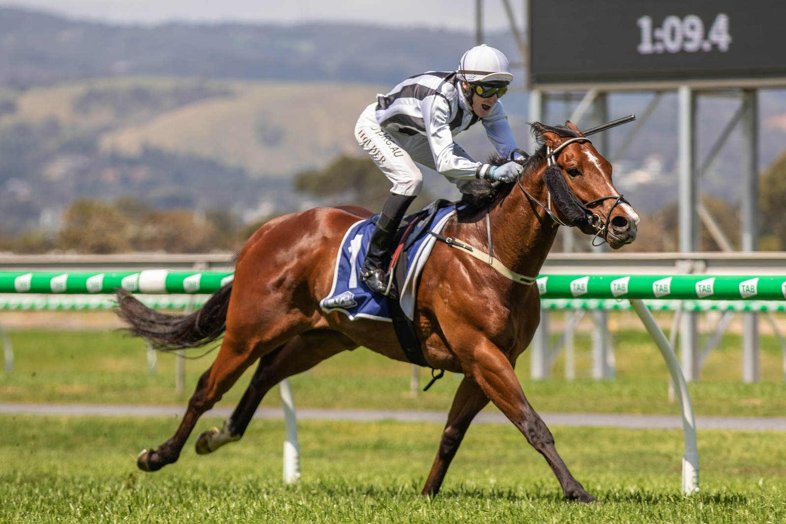 IMAGE: Jason Holder shows his delight as Extra Time strides to an impressive victory in the $100,000 Rebel Raider Series final at Morphettville on Saturday.